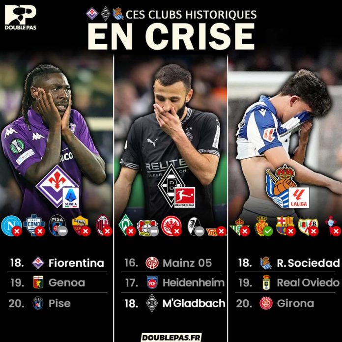 Bastions de l’élite, ces clubs ont pris du retard à l’allumage en championnat, si bien que leur place parmi les grands est aujourd’hui menacée. Cette position inhabituelle et périlleuse met en lumière les failles et les échecs de ces vieux dinosaures. Le changement, c’est maintenant.