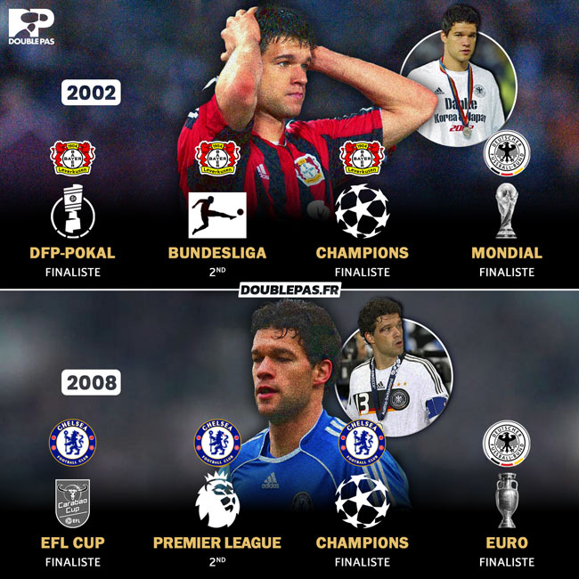Milieu d’exception des années 2000, Michael Ballack s’est malencontreusement illustré par sa malchance en matière de palmarès. Si proche de tutoyer les sommets, Der Capitano repart avec une armoire vide de trophées majeurs, notamment en 2002 et 2008, aussi bien avec ses clubs qu’avec la Mannschaft. Présent malgré tout dans des équipes marquantes, il peut se targuer de figurer sur la célèbre photo immortalisant la reprise magistrale de Zidane. Un coup de grâce qui mit fin au rêve européen de l’Allemand. Un enchaînement de circonstances pour le moins fâcheuses.